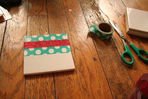 En primer lugar, cortar varias tiras de cinta Washi o pato y colocarla en posición horizontal sobre la baldosa cerámica. Puede hacer este paso en una variedad de maneras y utilizar una variedad de colores y patrones.