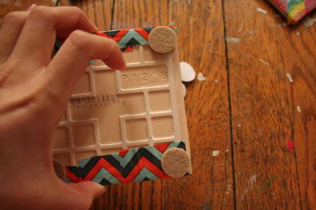 Por último, terminar con cuatro círculos fieltros autoadhesivas en cada esquina. Esto es para evitar el posavasos de rayar la mesa.