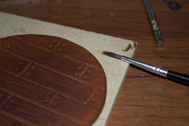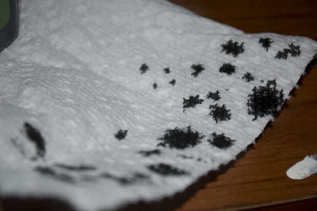 el tinte se aplica a la esponja y frote en si mucho queda en la superficie limpie lo con toallas de papel. para efecto añadido pone tinte negro en los orificios. Ahora deje el tinte filtra en resolver y aplicar una capa de super brillo para sellar todo