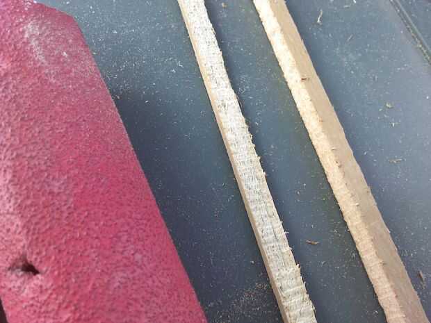 Este paso es bastante simple, pero probablemente la más mucho tiempo que no sea el pegado final. Toma un trozo de lija de grano áspero (60 80ish) y correr a lo largo de las esquinas para retirar los trozos colgantes de madera. Esto puede no ser un problema con la madera más reciente (no sé) pero con esta vieja madera seca había un montón de pequeños colgando de los lados de los cortes. Yo entonces también lijar los lados de los cortes. Lo suficiente como para sacar algo, marcas de dientes irregulares, pero dejando la textura rugosa del uso de una sierra de cinta. Otra vez no sé si fue a la sierra o a la madera vieja. Yo no soy un experto por cualquier medio.
