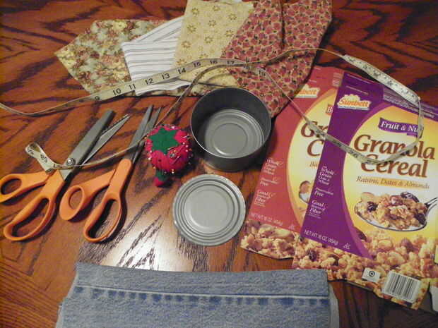 esto es un buen proyecto para utilizar algunos de los retazos de tela que sobra. Suministros que usted necesitará: de pollo, 12,5 onzas. lavar bien y quitar la etiqueta. caja de cereal, retazos de tela, desechos del dril de algodón, tijeras, tijeras dentadas, máquina de coser, hierro, cinta métrica, pistola de pegamento caliente y pegamento. hilo y aguja. clavijas rectas y 3 botones con la caña.