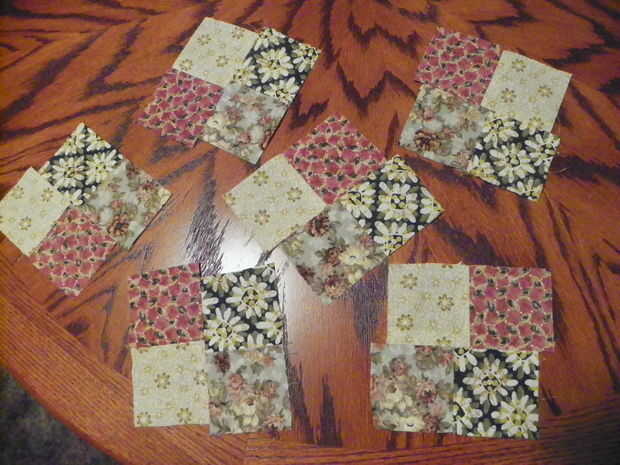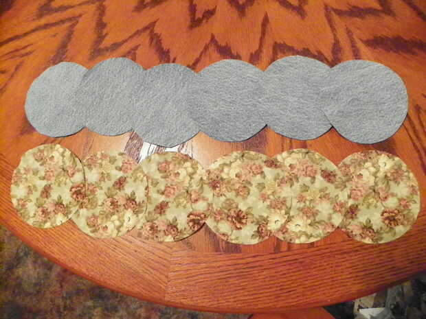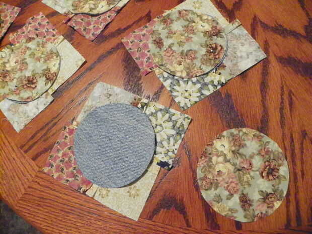 Comienza cortando un cuadrado de patrón 3". Cortar 6 piezas de 4 patrones diferentes de tela de algodón de peso medio de la luz. Me gusta usar una letra pequeña porque estas piezas son tan pequeñas. Se separa en 6 pilas, 4 cuadrados en cada pila. coser 2 plazas derecho lados juntos, margen de costura de 3/8". Presione abrir. Coser juntos las otras 2 plazas, pulse las costuras abiertas. Tomar estas 2 secciones y perno derecho lados juntos. No quiero las 4 esquinas se unan ya que pondría todo el grueso de la costura en un solo lugar, por lo que yo de aproximadamente 1/3". coser juntas las 2 secciones y presione la costura abierta. Haga un patrón para los prácticos de Costa girando la lata boca abajo sobre un pedazo de papel y trazar alrededor. este recorte y usarlo para cortar 6 piezas de denim y 6 piezas de tela para los fondos de los prácticos de costa. Coloque la cara de la pieza de patchwork sobre tabla. Coloque un círculo de denim en esto y luego coloque un círculo de tela sobre el dril de algodón. PIN 3 todas las capas juntas. Repita con las otras 5 montañas rusas.
