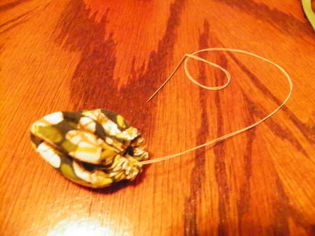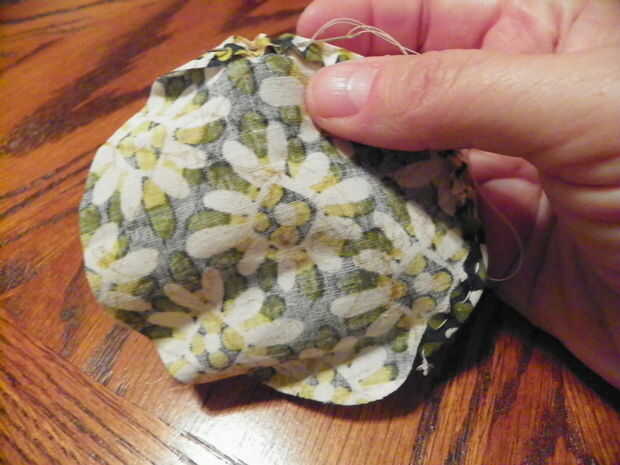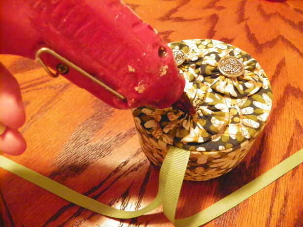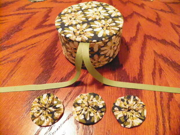 Cortar 3 círculos de tela, emparejando con el cubierto puede o contrastantes. 4" diámetro. Con hilo y aguja gire bajo aproximadamente 1/4" y se reúnen alrededor del círculo completo.  Recoger bien y fijar cosiendo en el mismo lugar 3 o 4 puntadas.  Repita con los otros 2 círculos y aplanar el yo-yo de fuera. Estas en la tapa del pegamento y pegar un botón en el centro de cada uno.  Colocar posavasos en la lata y atar la cinta en un lazo para sujetar.