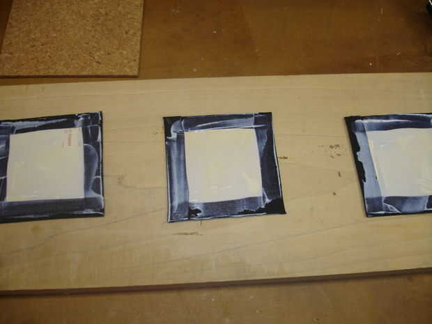 Usando el pegamento ProBond Advance, extendió una bonita capa en la parte posterior de la montaña. Colocarla sobre un trozo de corcho más grande que la montaña rusa. Después de esto, colocar entre dos piezas de madera y sujete durante la noche.