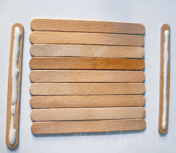 Agregue el pegamento a las varillas verticales y luego colocarlos encima de los palos horizontales.