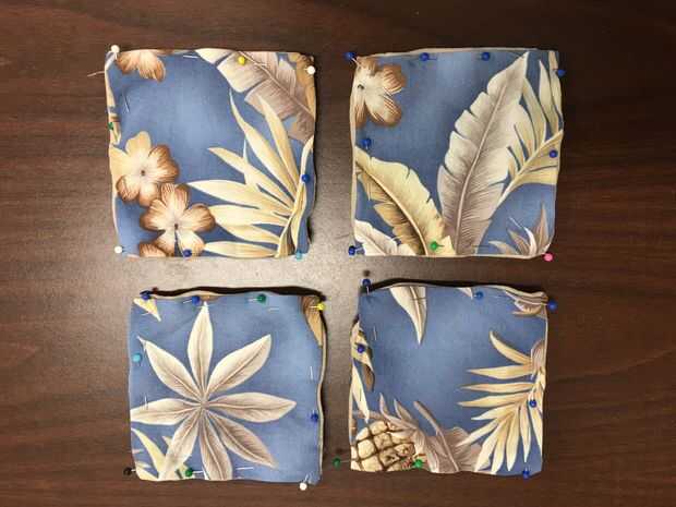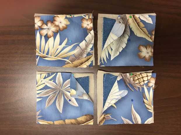Doble la pieza de abajo hacia arriba y sobre el dril de algodón, girar en la parte superior pieza 1/2" y colocar este borde doblado en la parte superior del borde inferior doblado. PIN. Repita con los otros 3 lados de la montaña. Doblar las esquinas en y.