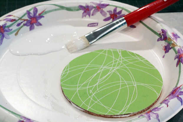 Capa de los posavasos de corcho con una capa de Mod Podge.