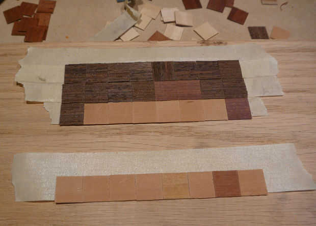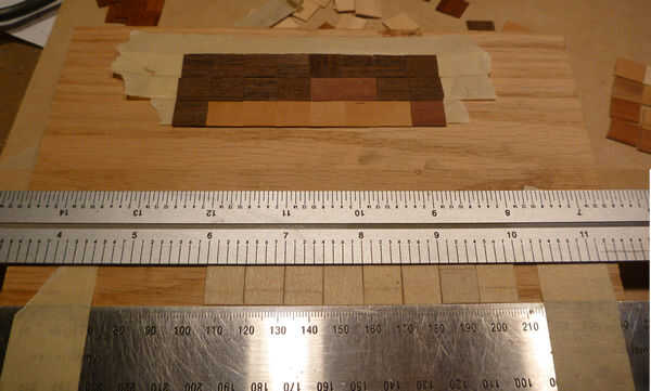 Puesto que mi casillas de chapa aún tenían cinta adhesiva sobre ellos, hice el diseño de la vuelta (de izquierda a derecha), que estaba mirando lo de debajo. Tipo de lo había desordenado, pero los gráficos son muy indulgente. Una vez establecido el patrón, transfirió, fila por fila, a mi plantilla de regla de dos. Cada fila se puso a lado de la cinta adhesiva y otra tira de cinta se utiliza para unir cada fila. Se me permite la cinta tiene un traslapo grande que utilizaría más tarde para unir las filas.