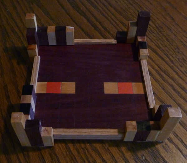 Para el titular, usé cuadrados de chapa un poco más grandes ya que yo todavía quería una cuadrícula de 8 x 8 pero es necesario que sea más grande que los prácticos de costa. De hecho, me engañó y eligió Enderman así podía evitar cortar demasiadas plazas más (mis manos todavía fueron dolor de la primera hornada). Utilicé un trozo de chapa purpleheart y corte dos ranuras para los ojos. Luego cortar seis plazas para los ojos y graba en. Usé las mismas técnicas de la chapa como en los pasos anteriores. Usé mi cuchillo Xacto para plazas en el purpleheart para simular bloques.
