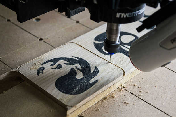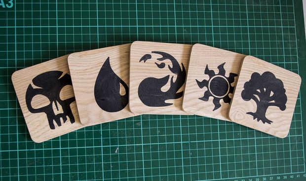 Volver al ranurador del CNC para cortar los posavasos. Lijar la Junta tanto deja un espesor no uniforme haciendo el corte a través de difíciles. Para superar esto, aseguró la Junta a un pedazo de viejo MDF y establece una profundidad de corte mayor que la parte más gruesa de la Junta, asegurando un corte completo a través de. La junta fue asegurada para el MDF con cinta de doble cara; una pieza con cada símbolo de maná. Una vez que una pieza está totalmente cortado, puede volar y hacer daño si no se asegura.