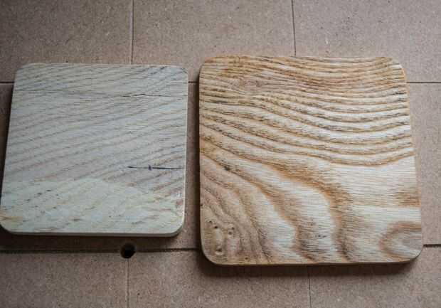 El acabado de aceite danés es opcional pero puedes ver que hace la diferencia en la foto de dos trozos de ceniza. Que la izquierda no ha sido tratado y el de la derecha tiene una capa de aceite danés. El pedazo de ceniza en la izquierda también es menor, esto es porque lo hice para usar como plantilla para cortar un corcho para pegar en la parte inferior de los prácticos de costa.