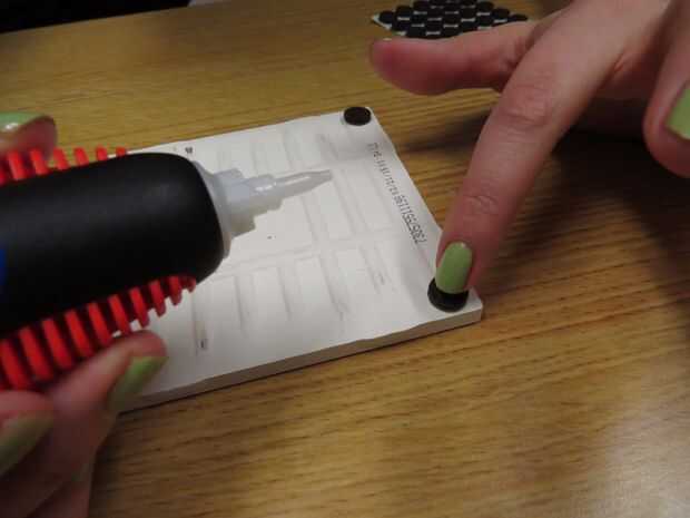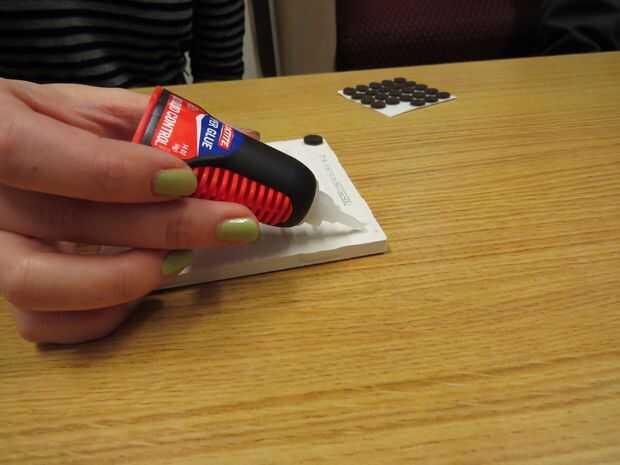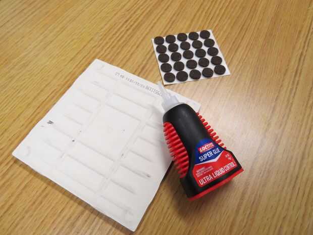 Tomar cuatro fieltro cojines por azulejos y pegamento les sobre los fondos. Pegue una almohadilla en cada esquina. Dejar secar durante unos cinco a diez minutos.