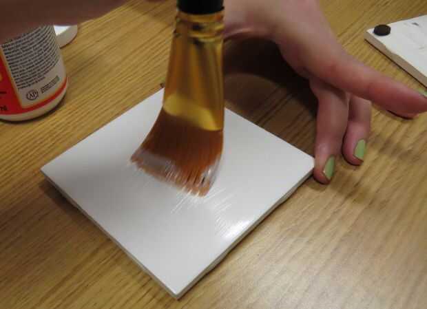 1. Aplique una cantidad tamaño cuarto de Mod Podge adhesivo en la parte superior de uno de los azulejos.