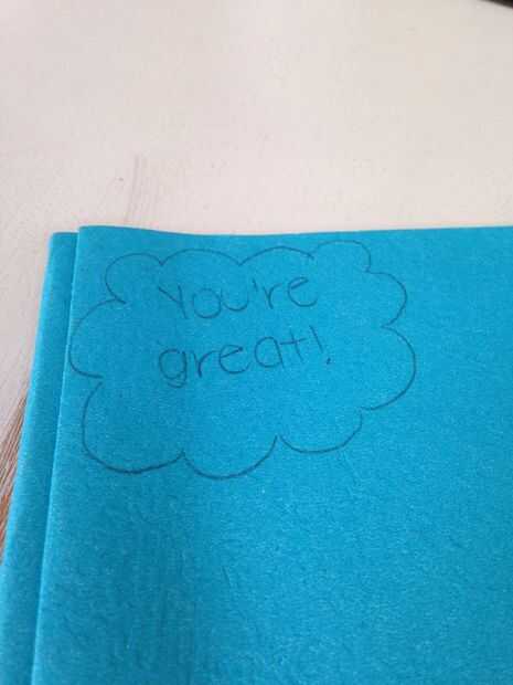 Ahora es el momento de escribir sus frases. Decidí escribir a lápiz primero por lo que podría hacerlo correctamente y a mi opinión para que después, podía trazar con rotulador. Escribir tan claro su primera frase en lápiz. Luego dibujar cualquier forma alrededor de él. Diferentes formas que pensé eran nubes, corazones, diamantes y círculos. Decidí dibujar las nubes, como se puede ver.