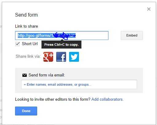 Aparecerá una pantalla que tendrá una opción para mostrar la URL. Haga clic en copiar la URL que se escupe hacia fuera. Más allá de en su web navegador y usted se encontrará en el formulario creado.