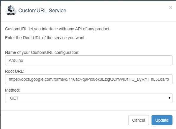 Vaya vaya mi servicios y crear un nuevo servicio personalizado. Usted necesitará ir al formulario de google y enviar una respuesta. Esto cargará la página de respuesta del formulario. Copia esta URL y delante de ella en la pushingbox dirección URL de servicio de campo. El nombre lo que quiere y establece el método para conseguir.