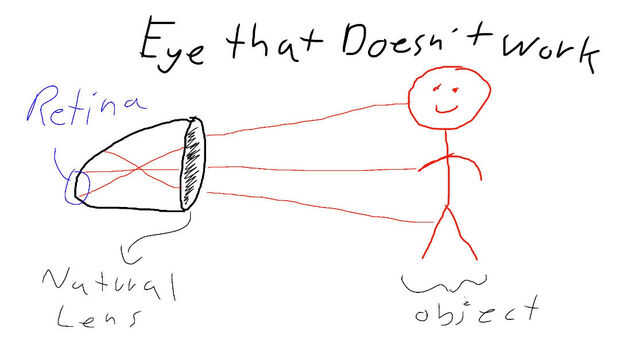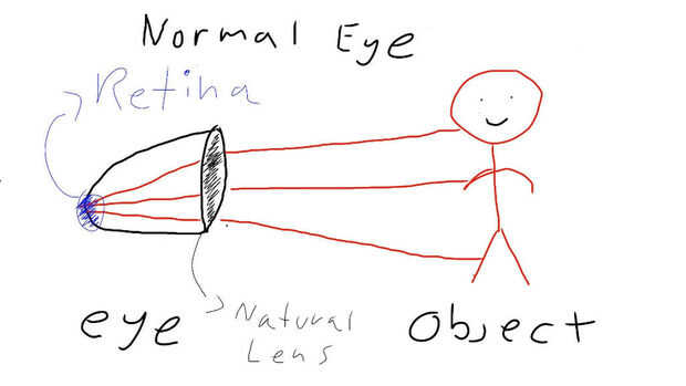 Para entender lo que está sucediendo que tenemos que comenzar con cómo nuestros ojos trabajan. Todos nuestros ojos, a menos que algo terrible ha sucedido, tienen un lente natural (un pedazo de tejido que es más denso que el aire pero todavía transparente) luz se dobla en la parte posterior de nuestros ojos (retina). Ahora lentes pueden sólo foco luz que viene de una distancia específica; por esta razón son fotos fuera de foco cuando un objeto está demasiado cerca de la cámara. Ahora para nuestros lentes naturales, la lente en el ojo es suave y puede haber cambiado su forma por los músculos en el ojo. Esto nos permite enfocarnos en cosas que están cerca de nosotros y cosas que están lejos. A menos que, por supuesto, nuestro lente natural no es la forma correcta. Esto hace que todo borroso sin importar mucho los músculos del ojo para que las cosas en foco.