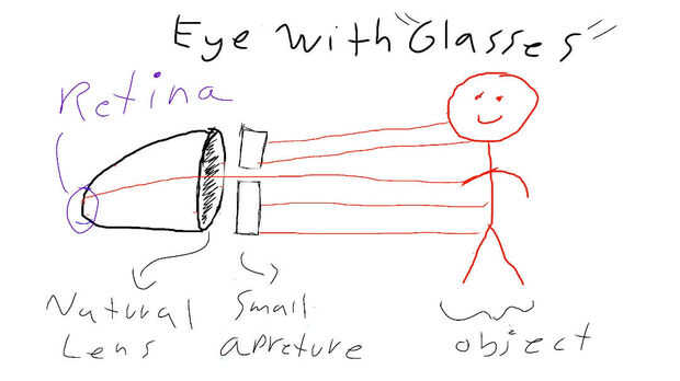 Así que ¿qué pasa si tomamos todos los rayos que llegan de diferentes direcciones y deshacerse de ellos y sólo tiene que utilizar uno? Ahora ya no tenemos que tomar un manojo de rayos y convergen en un único punto. En cambio, sólo dejamos que ray solo golpea en cualquier lugar de la lente y se verá como el objeto. Esto es lo que estamos haciendo por hacer eso realmente pequeño agujero con el dedo, todos esos rayos extras que necesitan centrarse y dejar sólo "un rayo" por el objeto a través de bloqueo. Esto nos permite ver, en foco, lo que está alrededor de nosotros a pesar de nuestras lentes naturales siendo deformados.