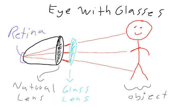 Así que nos hemos inventado lentes correctoras (gafas) que sentarse delante de nuestros ojos y la curva de luz en una forma de contrarrestar las irregularidades que tiene nuestra lente natural. Ahora nuestros ojos pueden enfocar la luz viene a ellos en nuestra retina, nuestro cerebro hace su magia y nos podemos ver.