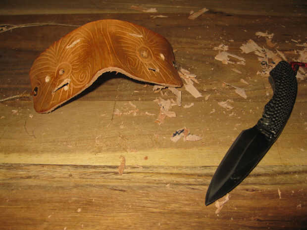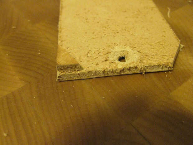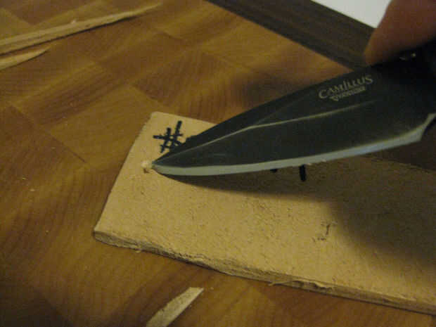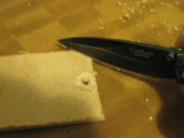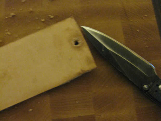 Para hacer estos agujeros se puede utilizar un sacador de cuero; sin embargo se puede hacer fácilmente con un cuchillo de bolsillo. Usando el cuchillo como un taladro, gire el borde cortante alrededor en un círculo. Pongo en dos agujeros lo suficientemente grandes para los ojales que estoy usando.