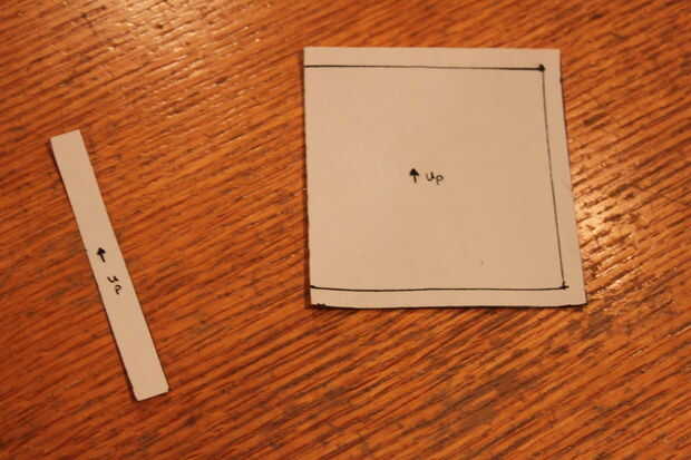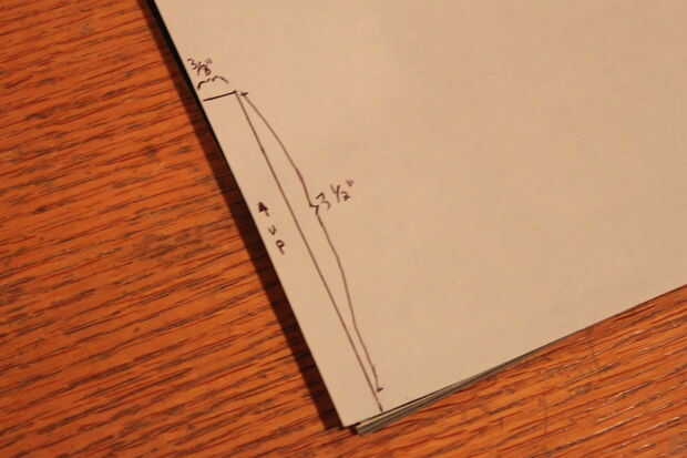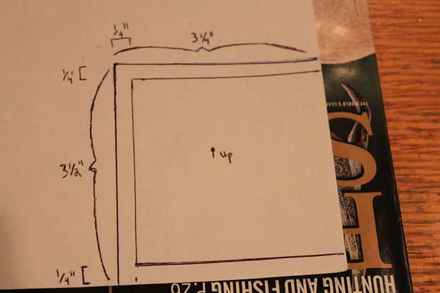En su papel de desecho, medir un rectángulo con las medidas de 3 1/2" y 3 1/4" como en la imagen. El 1/4" marcas no es necesarias, sólo me gusta agregarlas. Siguiente medida fuera un rectángulo 3 1/2" por 3/8". Se trata de la columna vertebral; corte ambos.
