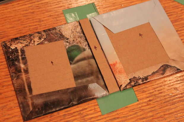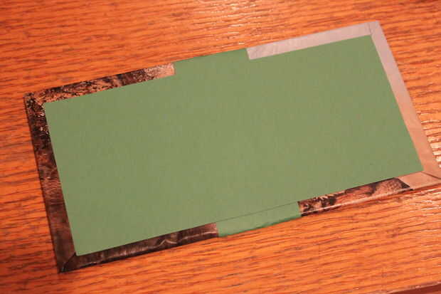Primero tome 1 1/2" por 5" tira y ponga debajo de las secciones, con la columna vertebral en el medio. Asegúrese de dejar algo de espacio en el medio. Pegamento en su lugar, baje el exceso y pegue demasiado. A continuación pegue el rectángulo más grande de eso. No debe mostrar ninguna cartulina.