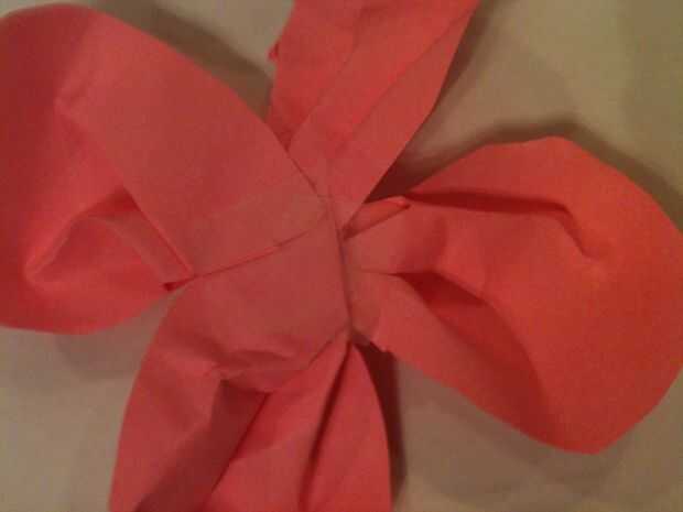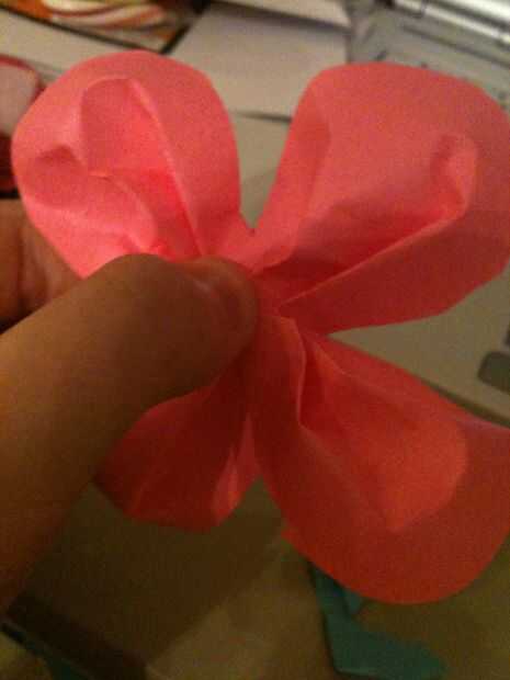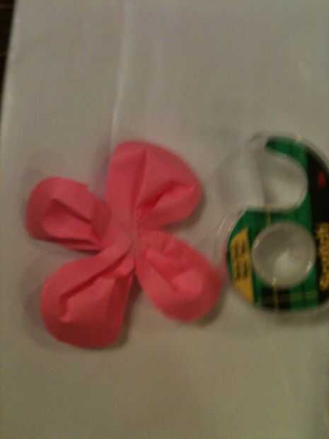 Juntar todos los cuatro pétalos, luego tomar un pequeño pedazo de cinta scotch y poner uno en el centro de ellas en la parte delantera y en el centro de la parte posterior. Tiene su flor!
