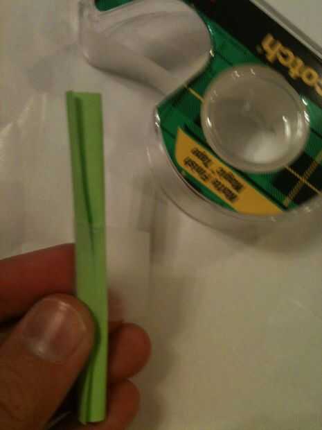 Enrollar una nota adhesiva verde y poner un trozo de cinta adhesiva sobre él para mantenerlo enrollado. Entonces, cinta adhesiva en el centro de la parte posterior de la flor.