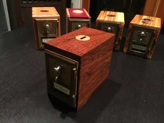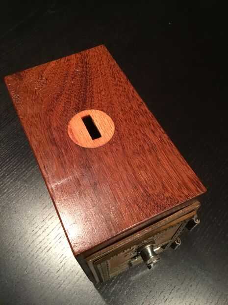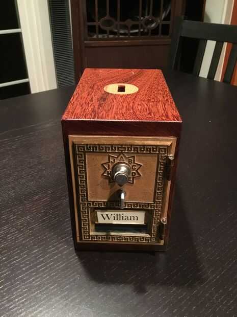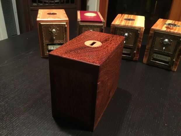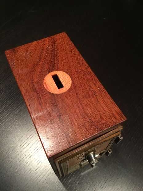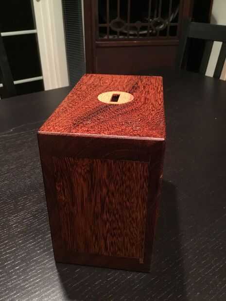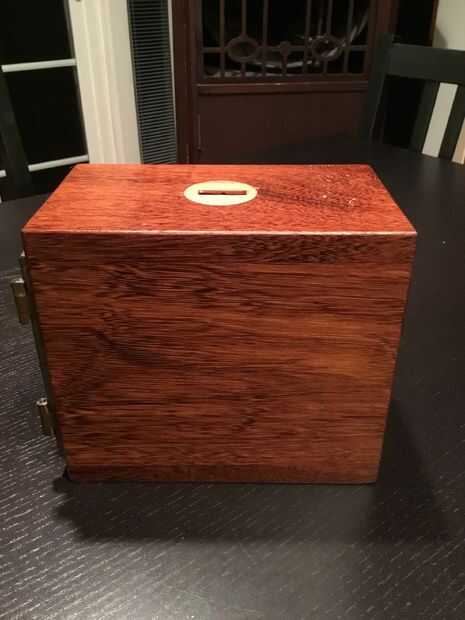 Brown heart...what can I say. Si alguien más aquí que lo ha utilizado antes, por favor, Dame algunos consejos. Lo compré porque pensé que se vería muy rico y "alma vieja", como el niño que estaba haciendo este cuadro para. Es una madera difícil de trabajar con. Obstruye todo. Arruinó por todos mi papel de lija en un día. La ranura de moneda se hizo el mismo que el primero pero inlayed de roble rojo. El corazón marrón era cierto espesor. Es decir, un verdadero pulgadas de espesor. No quiero arruinar mi cuchilla de Sierra de cinta corte usé la mesa de fresadora para cortar ranuras de 1/2 pulgada a lo largo de la parte superior e inferior. Esto ayudó a reducir el perfil global. Aún así, creo que este es mi favorito. Tan clásico. Terminada con aceite de linaza cocido, el grano reventado totalmente. Aún así, el anciano en el sentido de la orientación se echó a reír cuando compré la madera. Tomó las placas y dijo "café corazón... hmm. Buena suerte"