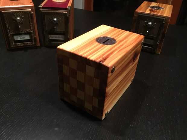 Yo tenía un montón de esas cosas de "lujo" de mi banco de hijas. Decidí incorporar a las finales dos de cajas. Como las otras cajas, es simplemente un pegado junto caja de madera. La diferencia en esta es la parte de atrás. Es un patrón de tablero de ajedrez. Tenía tablero de desecho restos de un intento fallido por hacer que mis papás urna un patrón de tablero de ajedrez. Usé mi cepillo de 12" para tomar hasta aproximadamente 1/4 de pulgada. Esta no fue mi mejor idea ya destruí casi todas y casi mi cepillo con él. Sin embargo, tengo una losa realizable y se ve cool.