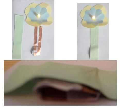 Utilice las tiras de cobre para conectar el LED al soporte de la batería. Asegúrese de que no toque las dos tiras. Coloque la batería (el círculo más pequeño hacia arriba) en el soporte de la batería para probar su configuración.