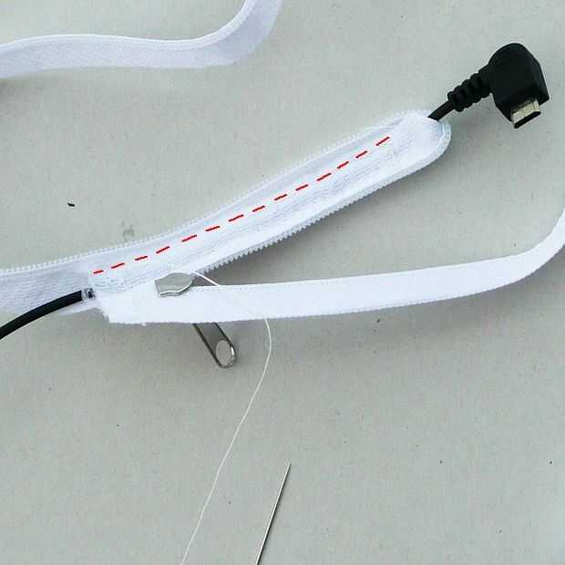 A continuación, ponga el extremo del enchufe de la cuerda entre las dos capas y cose el otro borde.