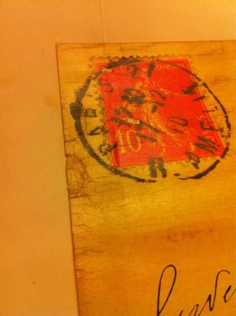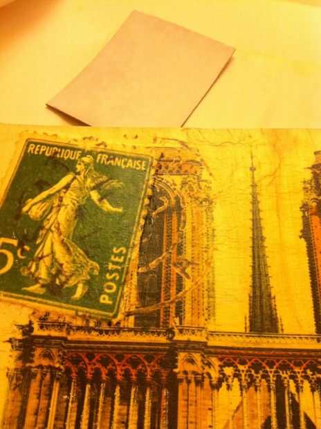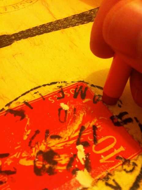 Lo primero que se puede hacer mientras la imagen está todavía húmeda y maleable es estampado. Esto consiste en colocar un trozo de cartón que coincide con la forma de un elemento de la imagen. El resultado es que la imagen se secará con una sección que sobresale. Esto crea más interés superficial, que es lo que la nueva tarjeta post inicialmente carecía. En esta imagen se destacó la tarjeta post. El extremo de un lápiz fue utilizado para hacer los bordes crujientes.