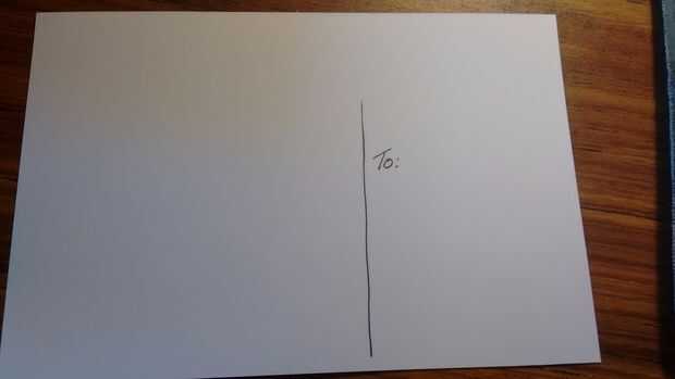 No necesita hacer esto, pero modificado para requisitos particulares la parte posterior de mi foto para ver más como una postal estándar, ejecutando una línea vertical de centrado para fijar el área de la dirección de la zona de saludo.