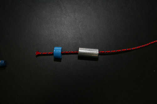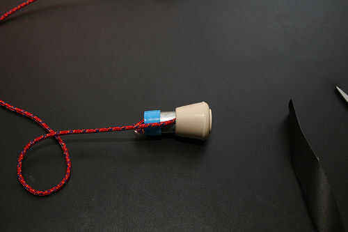 Pase la cuerda de paracaídas el pedazo corto de conducto eléctrico, luego poner la punta de goma en el conducto para captura la cuerda de paracaídas. Hacer esto de tal manera que el largo del pedacito de la cuerda de paracaídas es hacia el exterior. Agregar el buje de la EMT al final del conducto.