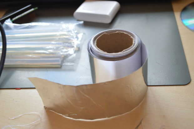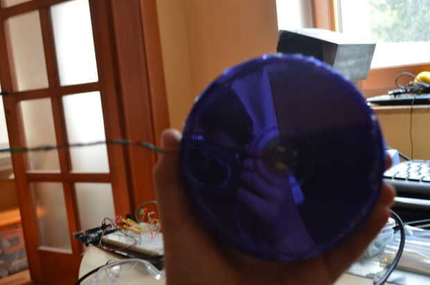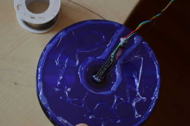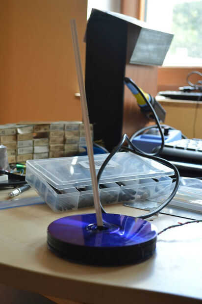 Ahora hacer posición fot eso poste y revise su sistema de cable. Ahora utilice su ranura para cables, ajuste altura y pegar ese último CD a la base. Y mientras el pegamento está caliente ajuste poste de casi 90 grados. También añadí cinta de aluminio a la base.