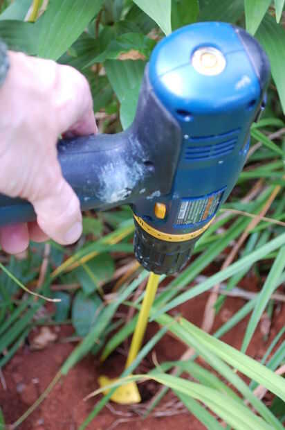 Para el cargo en mi casa, quisimos instalarlo en una cama de flores en el jardín del frente. Usé un 2,75" jardín auger bit ($14 en Home Depot). Tienes que ser paciente-taladro unas cuantas pulgadas a la vez, la suciedad y volver. Pude bajar cerca de 24 pulgadas, así que corte 12 pulgadas de PVC de 10 pies, porque yo sólo quería que fuese 7 pies sobre el suelo cuando se hace.