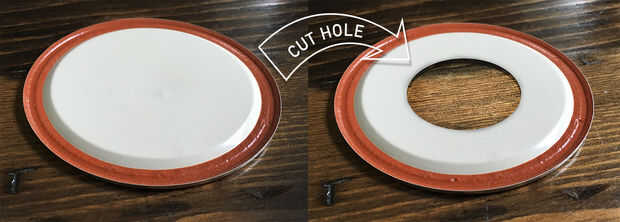 Medir su diámetro de zócalo de lámpara. Encontramos que 1 5/8" era un agujero perfecto para la mayoría de sockets. Usted tendrá que cortar un agujero para alojar el casquillo roscado en el centro de la tapa del metal. Hay una variedad de métodos para lograrlo. Empezamos marcando un círculo en la tapa con un marcador, y luego usando un taladro más grande poco, creando un agujero lo suficientemente grande como para trabajar tijeras cortar el círculo completo. Una broca graduado o una herramienta Dremel también pueden ayudar con esto. Por favor tenga cuidado al cortar la tapa de aluminio fuerte. Los bordes no necesitan ser especialmente perfecta como los anillos de casquillo roscado cubre el borde expuesto.