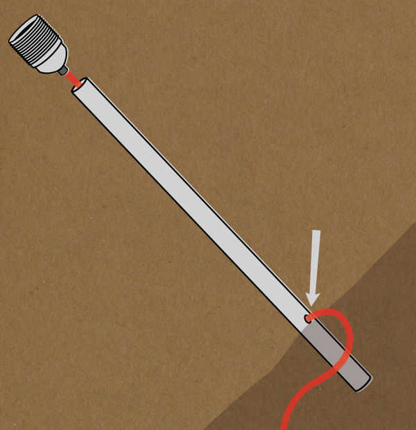 Si usted planea usar estas luces al aire libre, en la tierra, querrá volver a perforar un agujero en el lado de la tubería portacables, aproximadamente 16" más o menos desde la orilla inferior. Debe ser el diámetro de los cables eléctricos de su zócalo de lámpara.