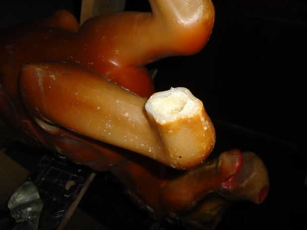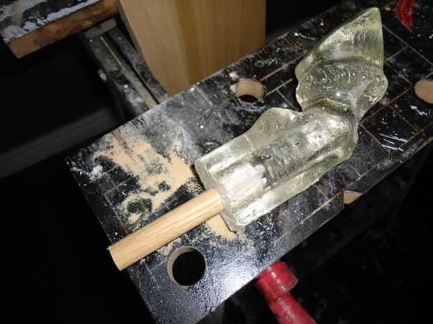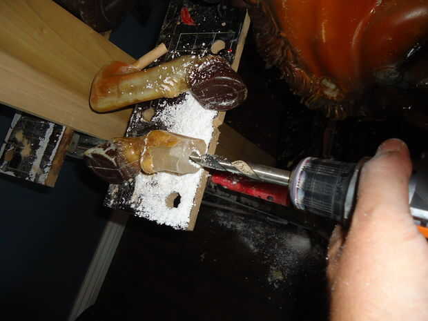 Para unir las patas al cuerpo del sierras de la pierna recta (donde las viejas piernas habían interrumpido) y luego corte de apertura las nuevas piernas de epoxy a la longitud correcta. En cada pata me perforó un agujero e inserta un taco "hueso" que pegué en el lugar. Entonces labró la espuma en el cuerpo donde las piernas debían fijarse. Colocar el cuerpo boca abajo llené cada pata con epoxy y luego inserta las nuevas piernas con los tacos en la espuma de epoxy. Estos fueron grabados en su posición para alinear las nuevas piernas con el cuerpo.