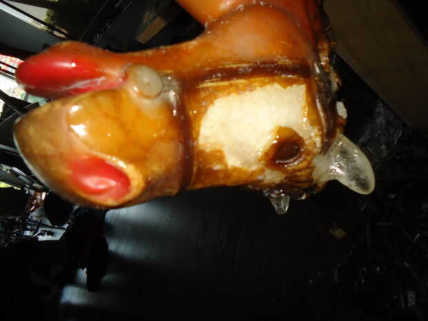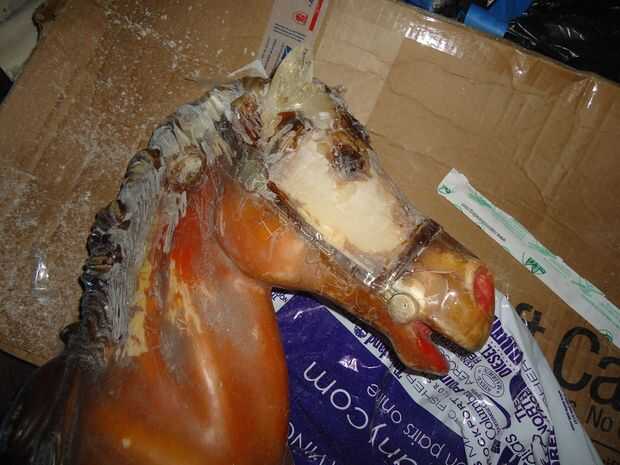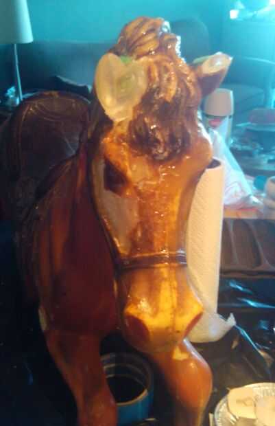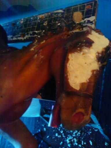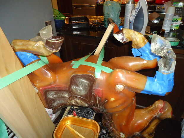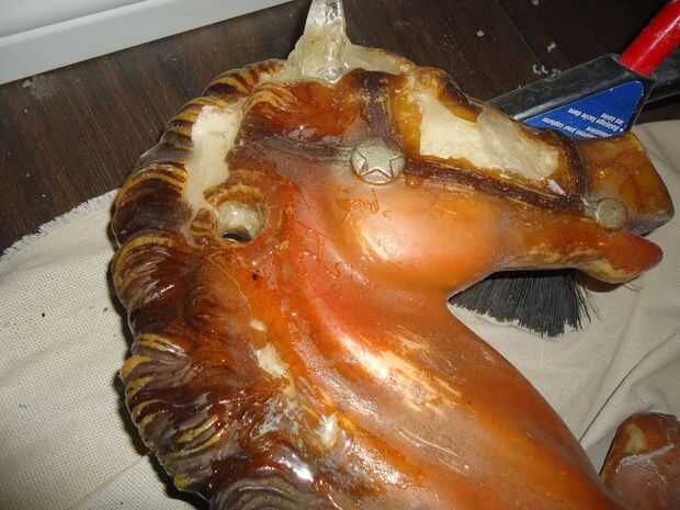 Donde faltaba la cara pude salvar el roto "ojo", una vez que la espuma fue cubierta en un par de capas de epoxi colocó el ojo en posición y extensión epoxy "duro" para crear los contornos de la cara de caballos. Una vez que todo lo había endurecido durante unos días para que se curaron totalmente solía una dremel más finalmente forma las articulaciones de epoxy y la cara.