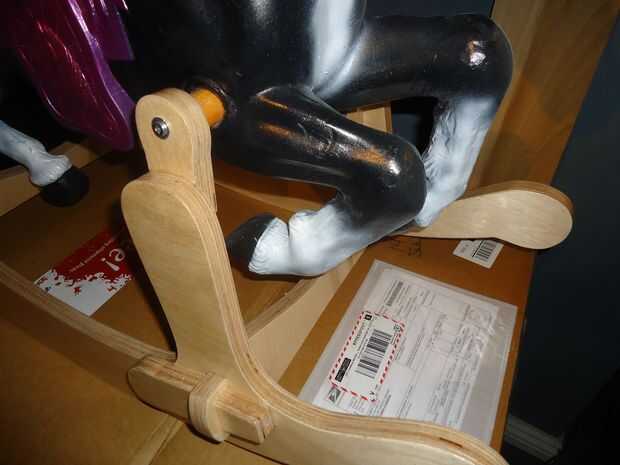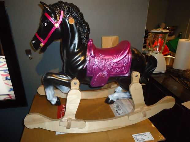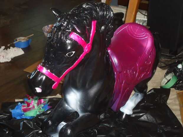 Después de que el caballo estaba pintado con una base negra con cinta de la silla de montar y me rocía una capa base de color púrpura. Entonces sacó un pincel de aire (elegí este por debajo 20 dólares en una subasta del país, y puesto que no he nunca utilizado uno antes de que practiqué sobre alguna cartulina durante un tiempo). Yo superior cubrió el sillín con un morado metálico y luego con cinta las pezuñas y cara para aplicar los puntos blancos. En la boca, nariz y oídos he añadido algún rosado para el realismo. Finalmente pintado a mano los ojos y pedacitos de oro sobre el frenillo y la silla de montar.