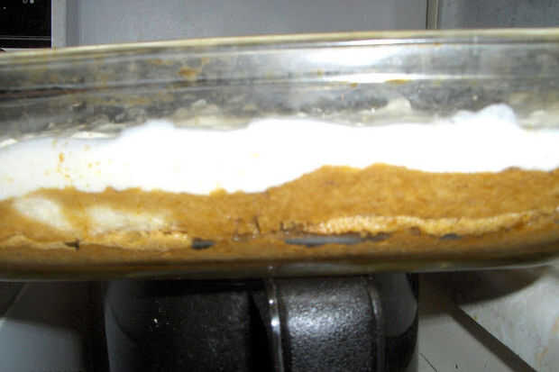 Batir queso crema, el edulcorante y el yogur hasta espesan y cucharada de la mezcla de queso crema sobre el bizcocho humedecido. Encima la crema de queso con otra capa de bizcocho humedecido y otra mezcla de queso crema.