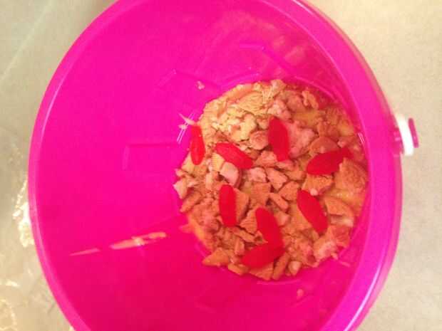 Añadir unos 10 peces suecos a la parte superior de la galletas Oreo machacada.