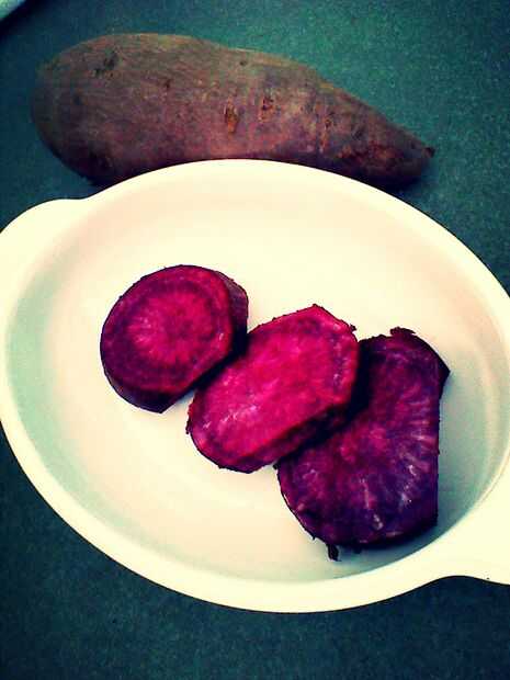 creció en Hawaii, y hay estas patatas grandes que son comunes de encontrar en los mercados llamados Okinawa batatas.  Están tan en el exterior y púrpura en el interior.  Cuando tienen un cremosos textura y son bastante dulce.  Recientemente re descub