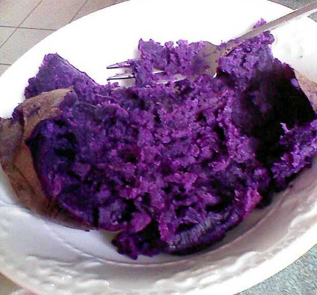 creció en Hawaii, y hay estas patatas grandes que son comunes de encontrar en los mercados llamados Okinawa batatas.  Están tan en el exterior y púrpura en el interior.  Cuando tienen un cremosos textura y son bastante dulce.  Recientemente re descub
