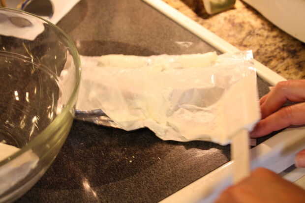 En un bol grande, mezclar el queso crema, el azúcar y la vainilla con una batidora y luego sobre cruasanes. En la hoja de papel encerado, extienda el segundo paquete de croissants, juntar las costuras.