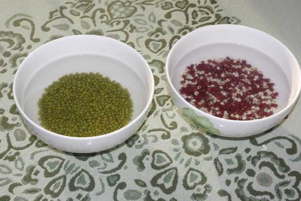 Cocer a fuego lento frijoles en dos botes separados alrededor de 2 horas cada una hasta que fofo. (Yo usé una olla pequeña y una olla de arroz)
