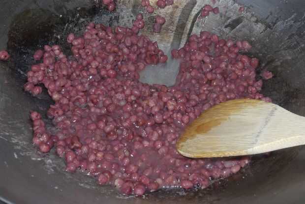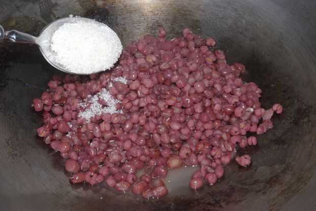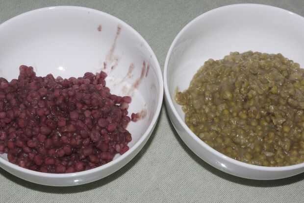 Después se cocinan drenaje pero retener los líquidos (ponerlos en canto en diferentes contenedores). Ponga 1 tipo de grano en una sartén y agregue aproximadamente 1 cucharada de azúcar. Sabor. frijoles deben tener dulzura un poco pero no tan dulce como usted quiere comerlas por sí solas como postre (recordar que añadiendo leche condensada más adelante), poner en un cuenco y dejar enfriar en nevera.