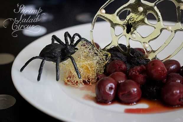 Asamblea - esperar a montar hasta que justo antes de servir. Poner una cucharada grande de ganache de chocolate espeso (o grueso helar si prefiere) en el centro de la espalda de un plato pequeño. La cuchara algunas guindas en almíbar alrededor de la parte delantera derecha de la ganache. Coloque un saco de huevo azúcar hilada la la izquierda de las cerezas con un pie de araña plástico protector sobre él. Meter una web de azúcar en la ganache, y listo!
